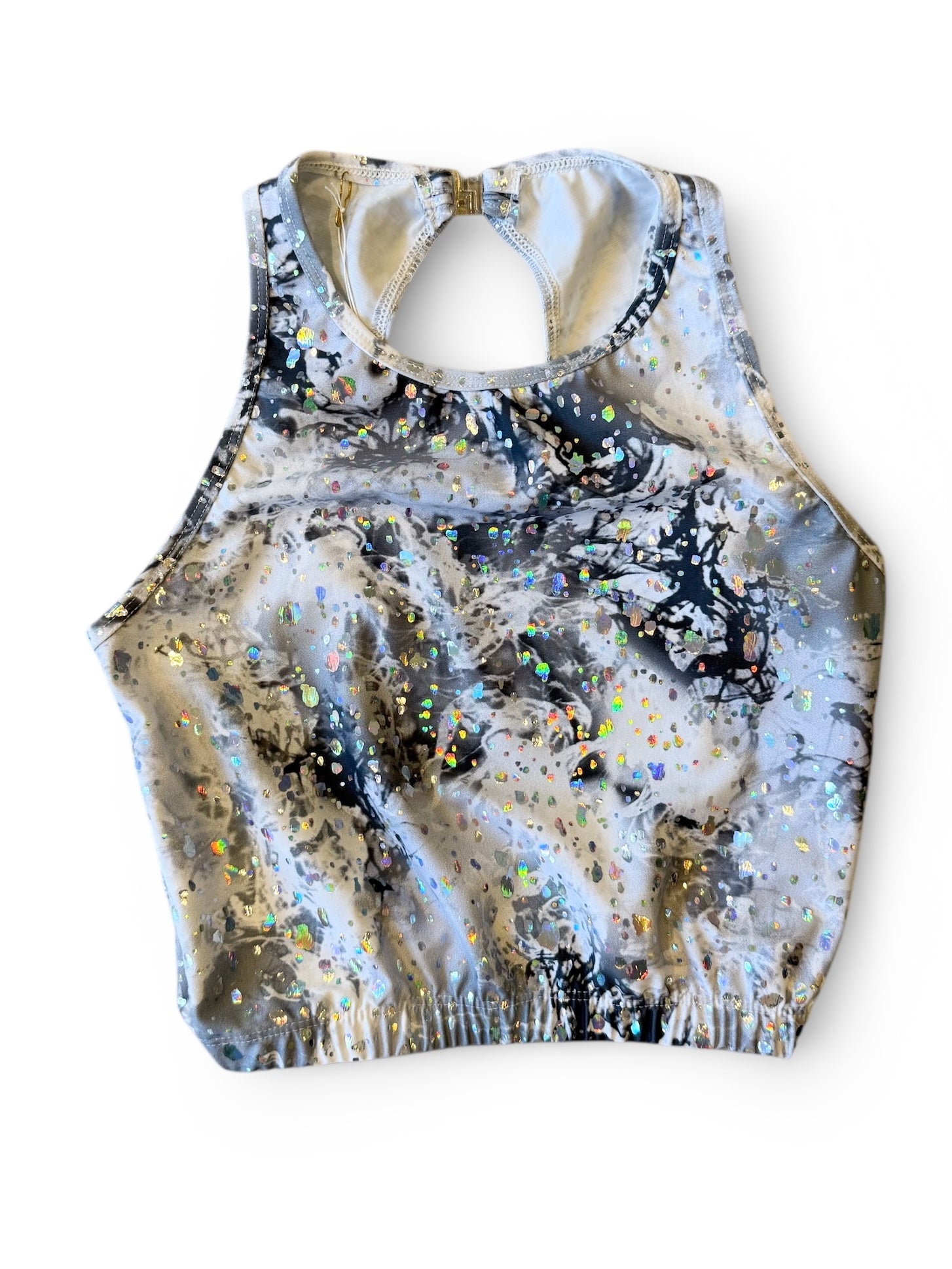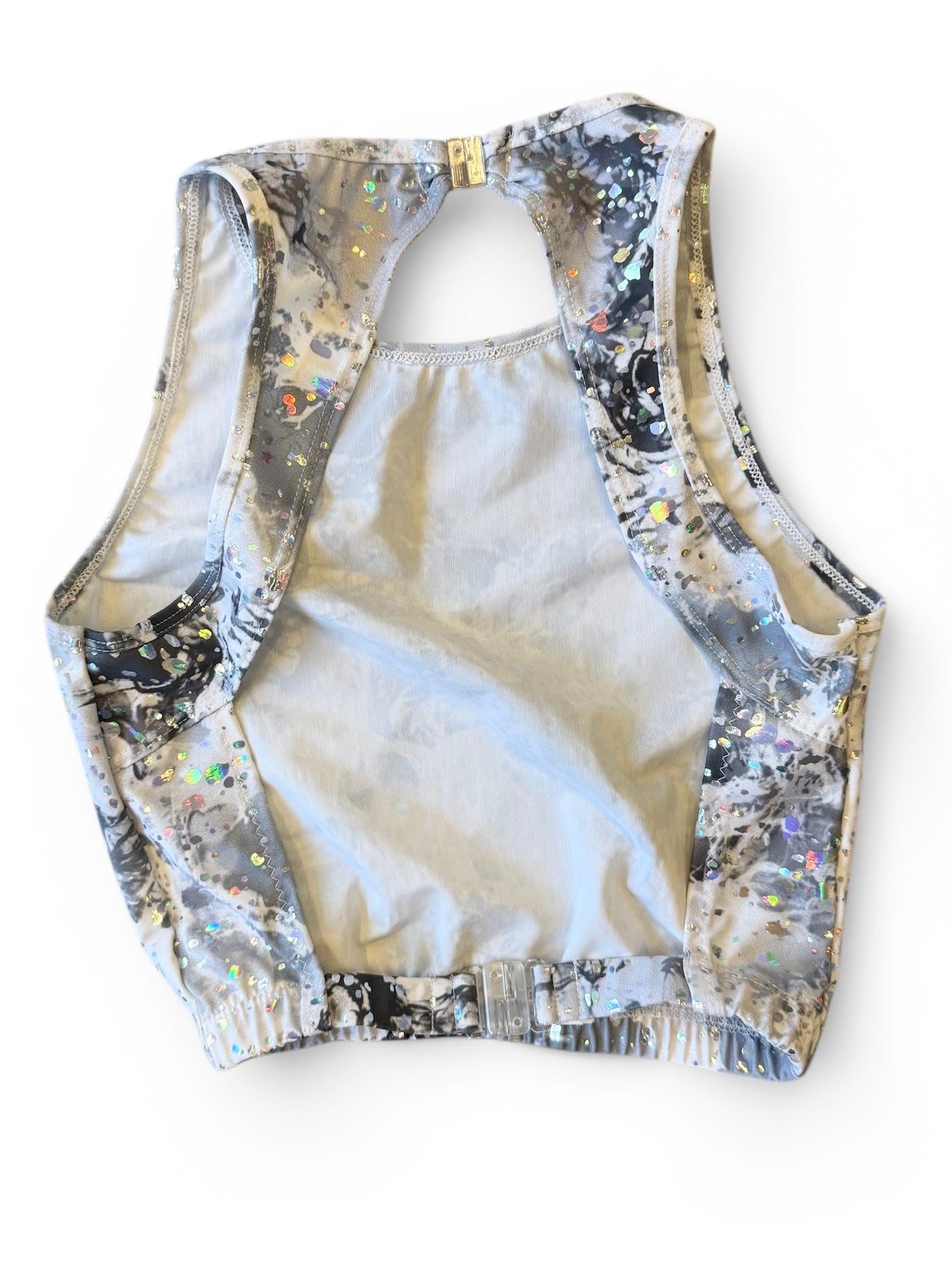 Top med åben ryg. Grålig glimmer. Str. 12 år.